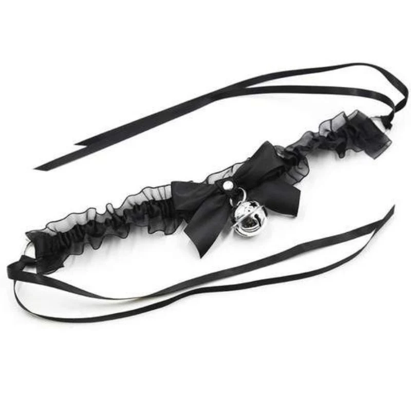 Des cordes en ruban sont attachées aux anneaux métalliques en D à l'extrémité du collier. Elles assureront un bon ajustement et une fermeture sûre. Mettez ce collier autour du cou de votre fille avec la cloche et le nœud sur le devant. Ensuite, attachez les ficelles pour le fermer.